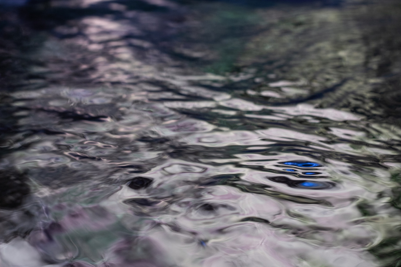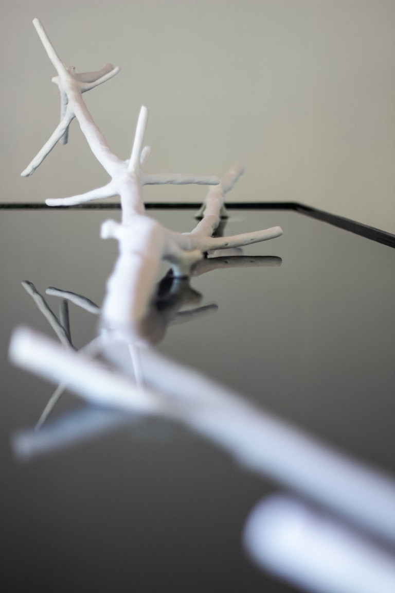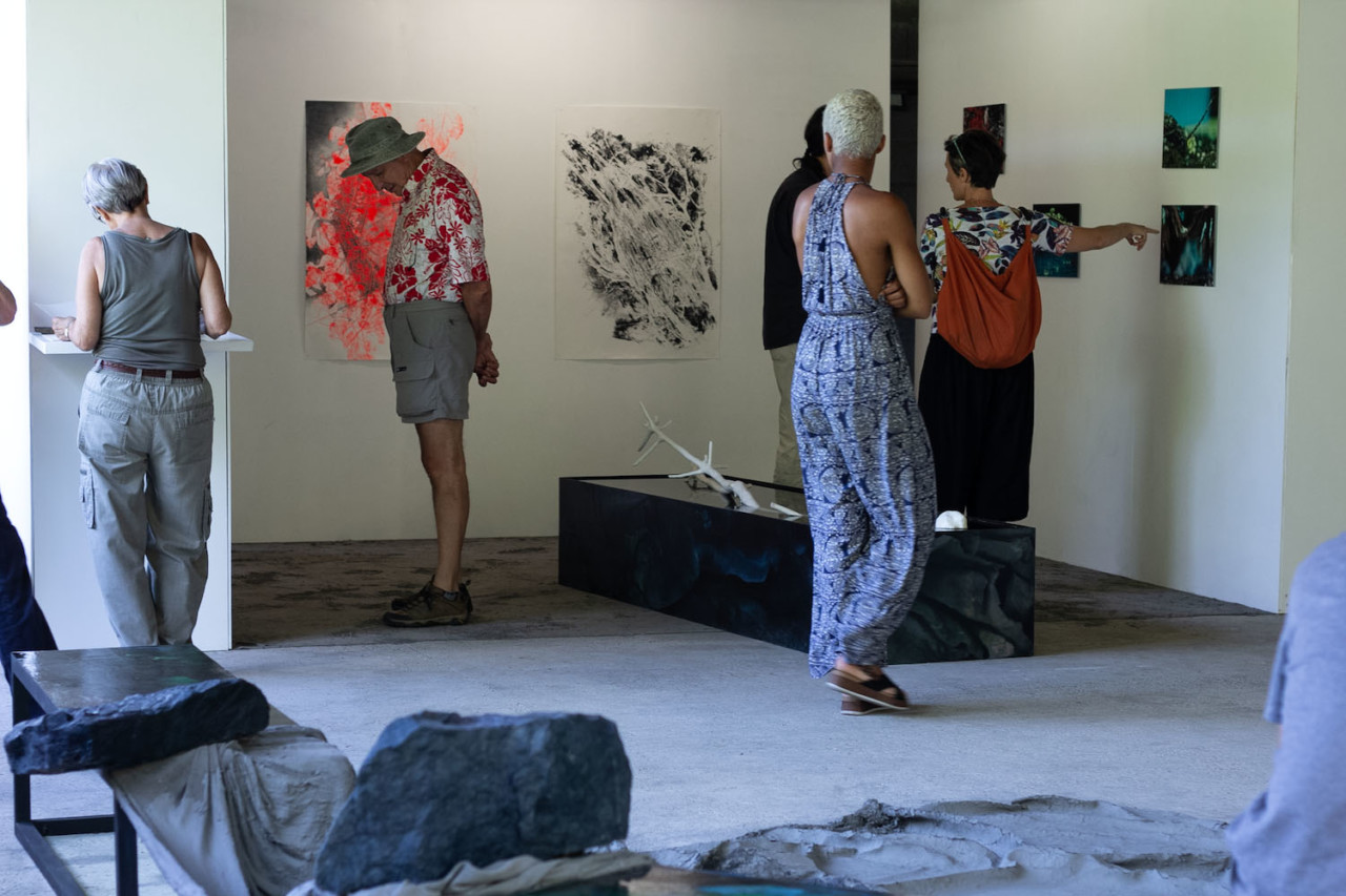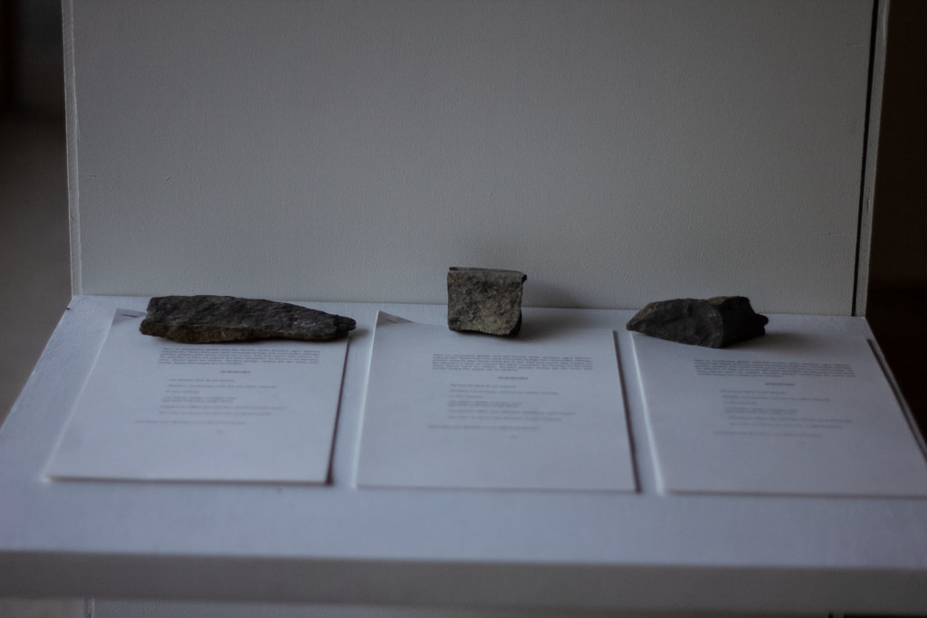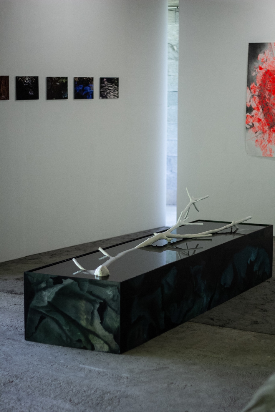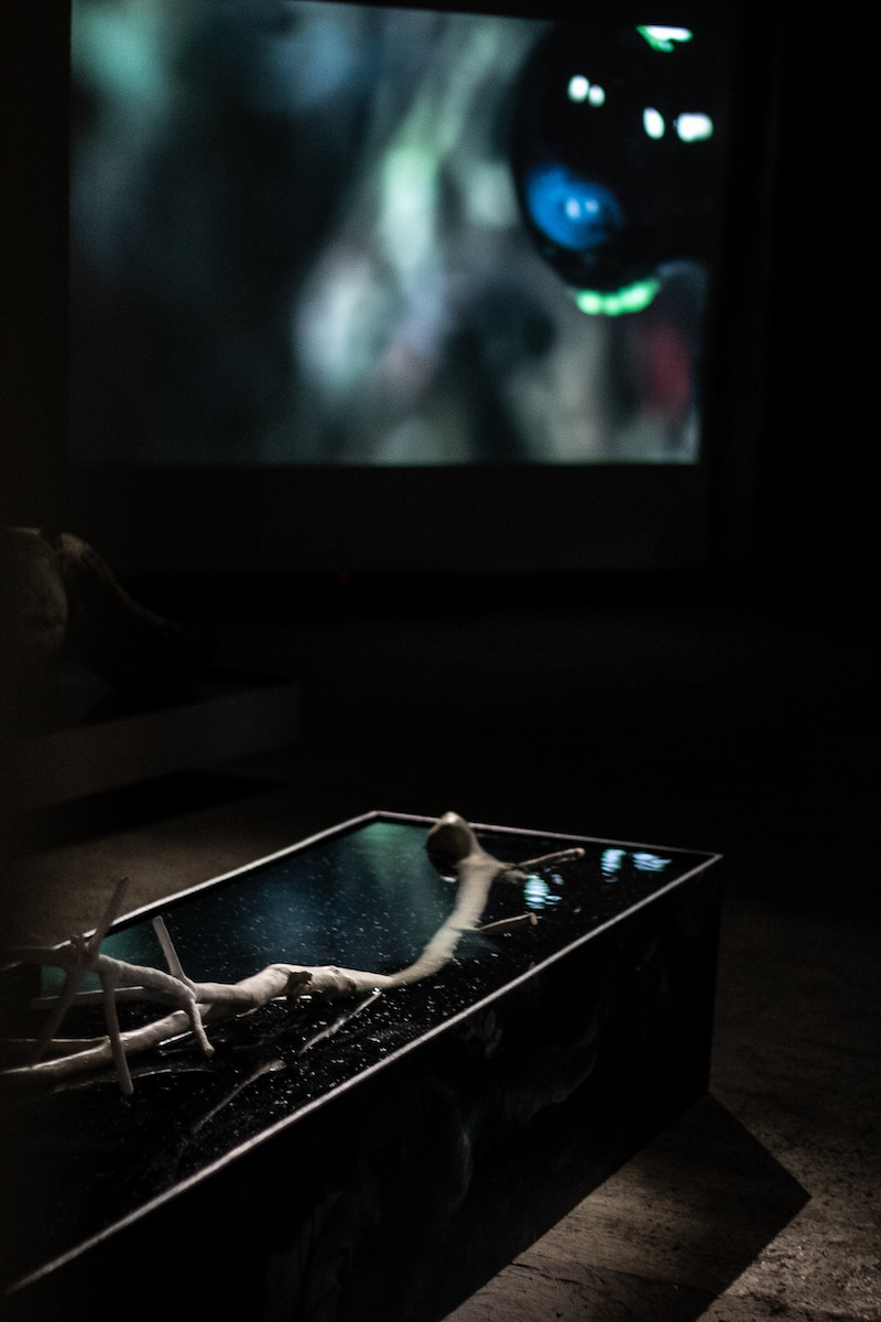 Les œuvres se lient par cette image de l’eau rare qui revient en pensée, sous les surfaces plastiques, dans les marques du dessin ou les réminiscences photographiques. Des empreintes de plantes encrées, en photographie les témoignages intimes de la surface de l'eau. Une étendue de terre craquelée au sol accueille le pas du visiteur, une grande cape de tissu infusé de limon recueille une eau opaque. Un texte, Aurafort, à propos d'une montagne, sa condition sèche, les rêves d’eau qu’elle fait. Avec la tombée de la nuit, un film apparaît sur l’écran du préau : mouvements minces des liquides et particules du sol. Les visiteurs sont invités à découvrir les fluorescences de la nature à la lumière de torches ultraviolet.